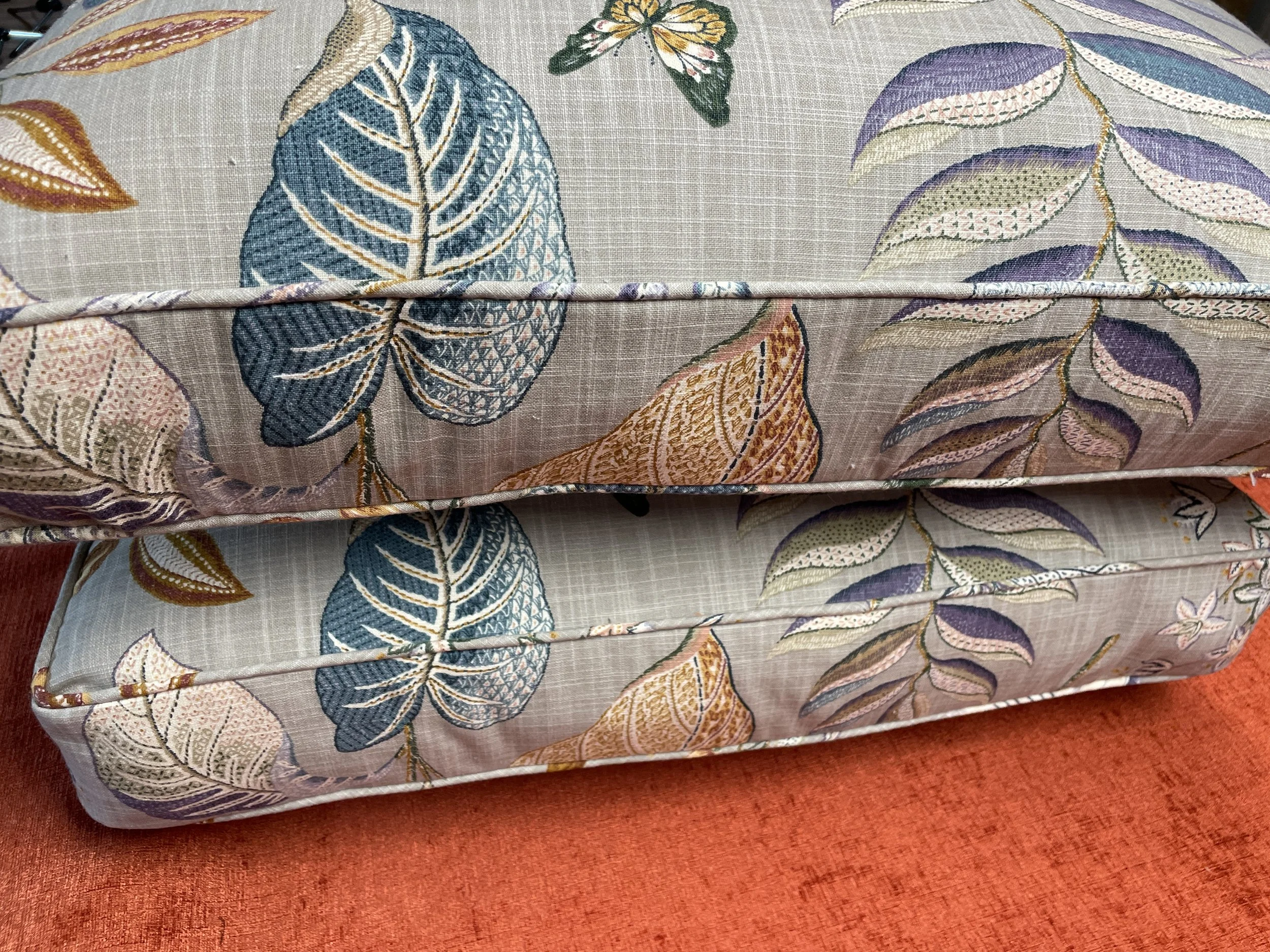 Custom cushions can be for the inside or outside of your home. There are lots of options to work with on the style and details you are looking for. We pride ourselves on the perfect fabric pattern match across the cushions so your eye goes right around the edge.